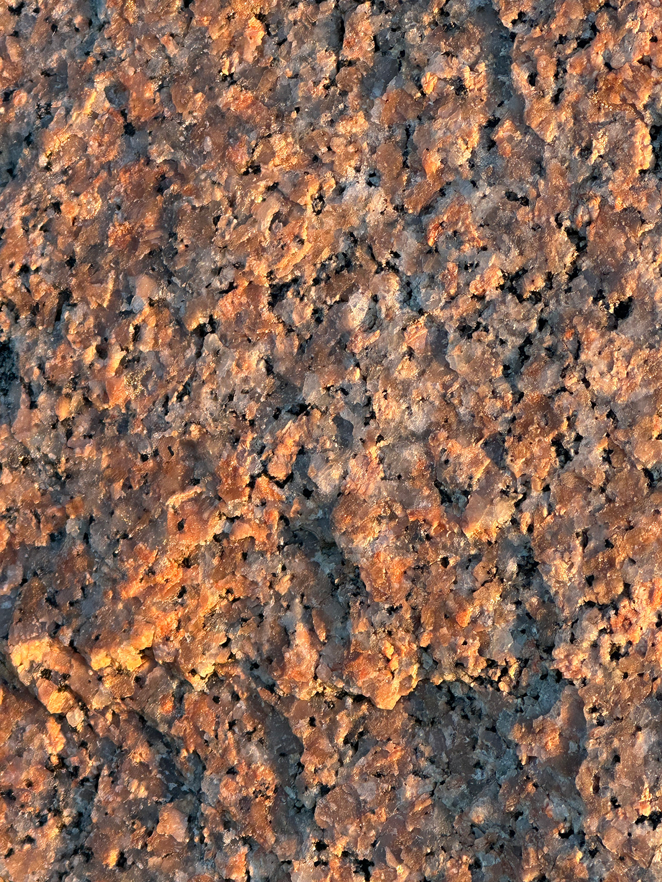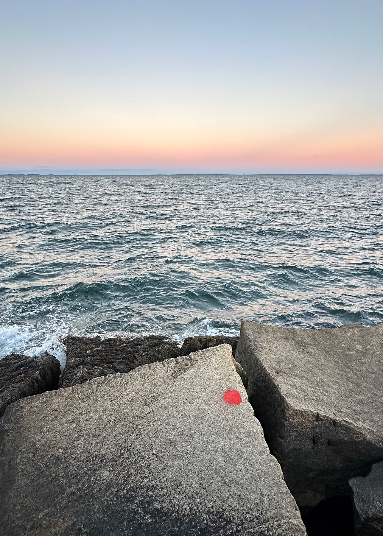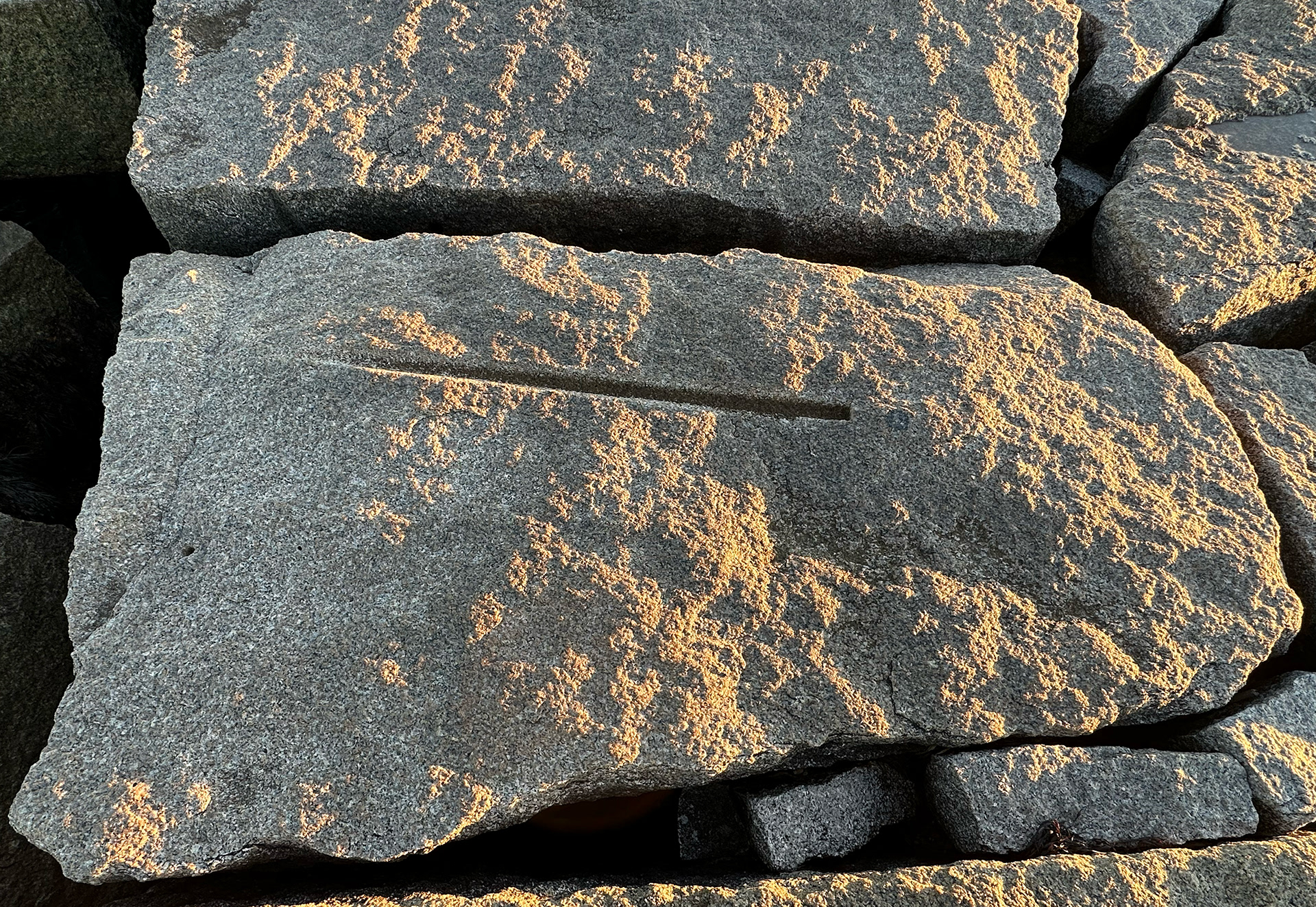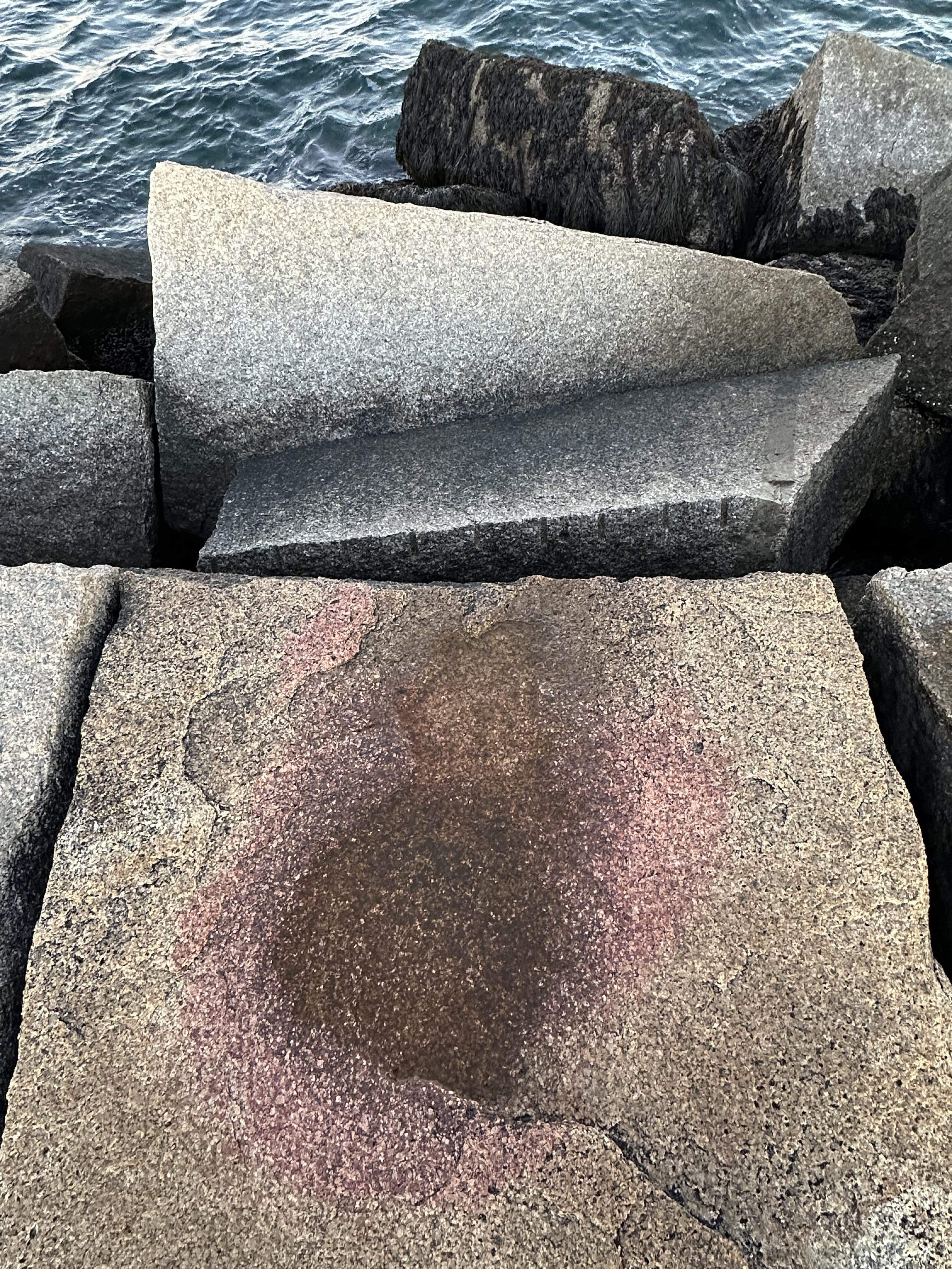 Rock surfaces along the coast are marked by forces operating at different timescales. Water carves circular forms over millennia. Spray paint marks the surface in seconds. Industrial machinery cuts precise diagonal lines. The same rock particles are photographed in cool daylight and warm sunset light, emphasizing how changing conditions alter our perception.