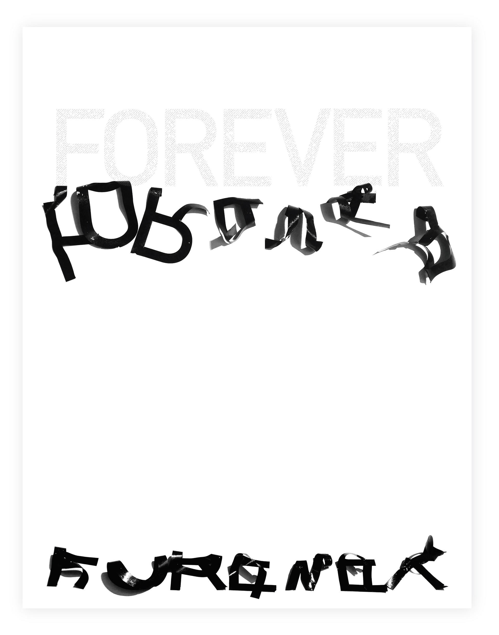 This digital collage documents peeling and fallen vinyl signage, highlighting the ephemeral nature of messaging. By photographing this word in various states of legibility, the work represents the fleeting life of breaking news cycles, the impermanence of public communication, and the traces that persist after messages lose relevance.